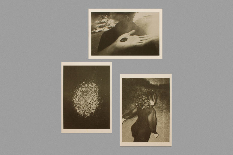 Caixa com berço revestido em papel Savile Row Tweed e fecho de imã feito pelo Estúdio Luciana Prado, contendo 3 prints tamanho 20x28cm em papel artesanal de fibras naturais impresso pelo artista.